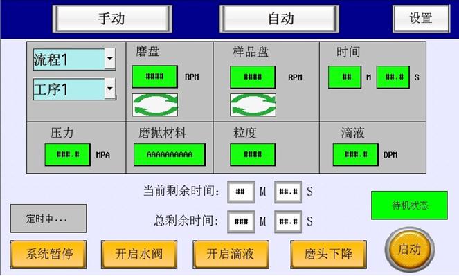2) 單工序模式:根據每一步磨拋工序,可設置和調用30種工序參數:磨盤和磨頭轉動速度、磨拋時間、水通斷……